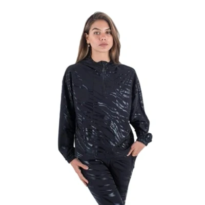 Half zip hooded jacket Color and print blocked Relaxed fit Encased elastic at hem and cuffs Locking front zipper