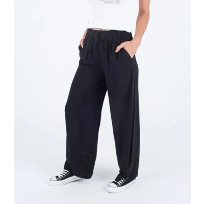 Straight leg pull on pant Elastasticated waistband with self ties Highwaist Trim inset detail at leg 29" inseam