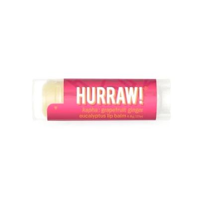 ONE 4.8g/.17oz Oval Tube of Kapha (grapefruit ginger eucalyptus) Lip Balm packaged in a white HURRAW! branded pillow box. An herbal infusion of tulsi. Invigorating and zesty grapefruit subtly melds with stimulating eucalyptus; fresh Malagasy ginger gives warmth. Energizing. Made with certified organic, vegan, and raw ingredients. Hurraw! Lip Balms are certified 100% all natural origin, cruelty and gluten free. Non-GMO. Bee, Shea, Soy and Palm Free. CRITERIA: Hurraw! Lip Balms are all natural, vegan, raw, made with premium fair trade ingredients, super smooth, not draggy, not sticky, not sweet, not too glossy, not too smelly. Never grainy. Long lasting and no melting in a back jean pocket! Made in Montana, USA. DETAILS: To ensure the integrity of our lip balms, we develop and manufacture fresh by individually pouring each balm in our USDA NOP (National Organic Program) and Ecocert certified facility. Our ingredients are also clearly and correctly listed on our balms. Plant based, cosmetic and USDA food grade. Derived from 100% natural sources and certified Ecocert COSMOS and NOP organic compliant. FLAVORS: Almond, Apple, Banana, Black Cherry Tinted, Chai Spice, Chocolate, Coconut, Coffee Bean, Earl Grey, Grapefruit, Green Tea, Hazelnut Tinted, Huckleberry, Kapha (grapefruit ginger eucalyptus), Lemon, Licorice, Lime, Mint, Moon, Orange, Pineapple, Pitta (coconut mint lemongrass), Raspberry Tinted, Root Beer, Sun, Unscented, Vanilla Bean, Vata (almond cardamom rose), Watermelon, Wintermint. It's not about us. Since 2010, we’ve made our balms with one thing in mind: YOU. Hurraw! strives to create a trusted product to be used by everyone regardless of lifestyle. Let's put the concept ahead of the profit, the user ahead of the maker, the collective ahead of the individual.