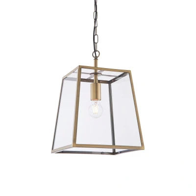 Inspired by box lanterns, the Hurst ceiling pendant is the perfect complement for today's relaxed classic interiors. Finished in matt antique brassl and suspended from height adjustable chain with black fabric flex. Pair with vintage style filament LED lamps that are perfectly framed by the subtle tapered metalwork and large clear glass panels.