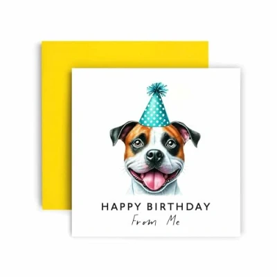 Wish your loved ones a Happy Birthday from the adorable American Staffordshire Terrier, featured in a delightful watercolour illustration wearing a party hat, brought to you by Huxters. Perfect for dog lovers! 350GSM Uncoated Paper: This birthday card for men and women is made with premium uncoated paper, with compostable polybag and intense non-fading colors achieved through state of the art printing technologies. Elegant Envelope: Now you can say goodbye to the constant hassle of trying to find a suitable envelope! This Friend birthday card arrives in a cute yellow envelope, keeping your card away from dust, oily fingerprints, or from curious eyes! A Personal Touch: With a blank and fully customizable interior, this happy birthday card for her allows you to express your birthday wishes in a cute and personal way, nicely accommodating your words, drawings or poem! Fun and Versatile: These greeting cards are simple but eye-catchy and funny, which makes them extremely versatile and perfect for an unforgettable birthday! You can offer the card to both men and women of all ages, friends, family, best friend, fiancé, or spouse and be sure to make their day even more special.