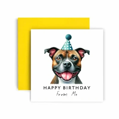 Wish your loved ones a Happy Birthday from the adorable Staffordshire Bull Terrier, featured in a delightful watercolour illustration wearing a party hat, brought to you by Huxters. Perfect for dog lovers! 350GSM Uncoated Paper: This birthday card for men and women is made with premium uncoated paper, with compostable polybag and intense non-fading colors achieved through state of the art printing technologies. Elegant Envelope: Now you can say goodbye to the constant hassle of trying to find a suitable envelope! This Friend birthday card arrives in a cute yellow envelope, keeping your card away from dust, oily fingerprints, or from curious eyes! A Personal Touch: With a blank and fully customizable interior, this happy birthday card for her allows you to express your birthday wishes in a cute and personal way, nicely accommodating your words, drawings or poem! Fun and Versatile: These greeting cards are simple but eye-catchy and funny, which makes them extremely versatile and perfect for an unforgettable birthday! You can offer the card to both men and women of all ages, friends, family, best friend, fiancé, or spouse and be sure to make their day even more special.