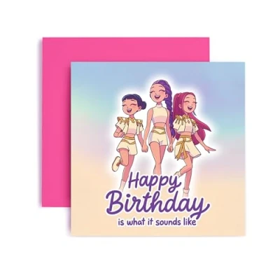 DESIGN THEME: Vibrant K-Pop inspired birthday card featuring stylish cartoon characters in trendy outfits against a gradient purple and pink background with stars. GREAT QUALITY IS WHAT IT SOUND SLIKE: Printed on high-quality card stock with a matching pink envelope, perfect for preserving special birthday wishes VERSATILE APPEAL: Ideal for daughters, sisters, friends and family members who love K-Pop culture, suitable for tweens and teens PERSONALISATION: Blank interior provides ample space for writing heartfelt birthday messages and greetings PRESENTATION: Standard greeting card size with eye-catching typography and modern popstar aesthetic, perfect for displaying or gifting