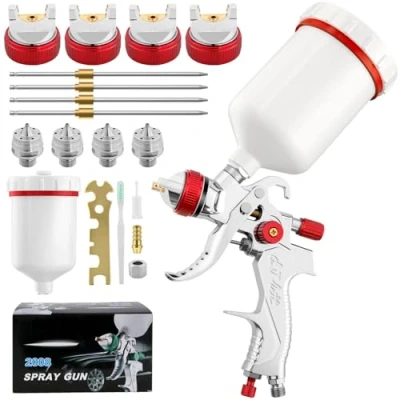 【Professional HVLP Air Spray Gun for Versatile Coating】-This HVLP spray gun features a gravity feed system, offering professional-grade performance for a wide range of coatings. It’s perfect for base-coats, clear-coats, primers, and more, making it an essential tool for any project requiring precise application. 【Four Fluid Nozzles for Different Coatings】-Included are four different-sized nozzles, each equipped with a stainless steel needle and nozzle set. These nozzles accommodate various types of coatings, providing versatility for all your painting needs, whether for automotive, furniture, or appliance finishes. 【High Volume Low Pressure (HVLP) Technology】-The HVLP technology reduces overspray and applies paint with less force, ensuring a smoother finish with minimal waste. This results in more efficient use of paint and cleaner work areas, making it ideal for professional-quality results. 【Durable Stainless Steel Components】-Built to last, the spray gun features a stainless steel nozzle and needle, ensuring long-term durability. It’s compatible with water-based paints and offers extended service life, even with regular use. 【Wide Range of Applications】-Perfect for a variety of projects, this spray gun is ideal for spraying primers, clear coats, and high-viscosity coatings. Whether you're working on automotive detailing, furniture restoration, or appliance painting, it delivers flawless, even results.
