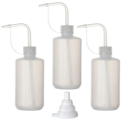 Polypropylene body is lightweight and flexible, easy to squeeze. The screw closure and angled spout molded in one piece, tightly fits the draw tube for leakproof service. The angled spout provides a uniform stream of liquid and the tip is covered with a similar shaped cap to prevent liquid coming out or drying. Clear scale marked on the translucent bottle for easy reading the volume inside the bottle, 25ml increment, total 250ml. Suitable for containing mild acids and bases, soap solutions, alcohol, darkroom chemicals, water and various aqueous solutions, certain organic solvents, etc. Coming with a silicone funnel for easy refilling liquid into the bottle.