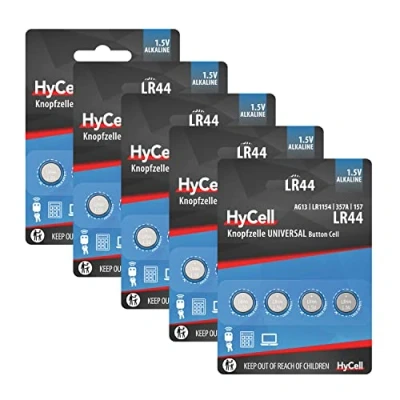 HyCell Button Cell Pack of 20 Alkaline Batteries LR44 1.5 V Premium Quality Battery for Daily Use in Devices such as Remote Controls, Car Keys, Calculators, Scales, etc.