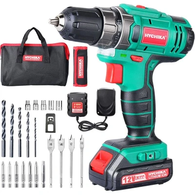 HYCHIKA Cordless Drill Driver 12V, Electric Screwdriver 30N·m, 21+1 Torque Drill, 2 Variable Speed LED Work Light, 1500mAh Li Ion Battery 25Pcs Accessories for Home and Garden DIY Project