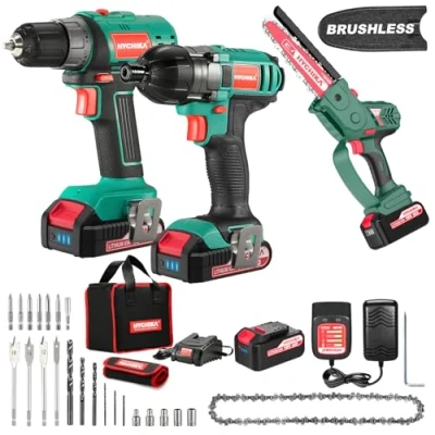 HYCHIKA Power Tool Combo Kit, Screwdriver 35 N.m + Impact Driver 160 8 Inch Brushless Electric Chainsaw, Tools Set for Home Garden Outdoor