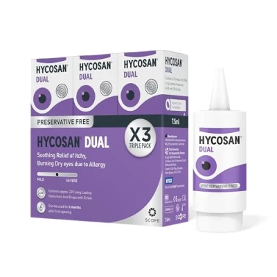 DUAL ACTION - Hyaluronic acid soothes dry eye symptoms while Ectoin relieves inflammation, irritation and burning caused by hayfever and other allergens such as dust and animal hair PRESERVATIVE FREE - With no added preservatives, which can irritate sensitive eyes, Hycosan Dual is gentle on your eyes and suitable for regular use FOR EVERYONE - Clinically proven and recommended by eyecare experts, Hycosan Dual is contact lens compatible. Safe for adults who are pregnant or breastfeeding and children EASY TO USE - Hycosan Dual Eye drops for dry eyes are contained within a unique bottle design that protects against contamination. 1 pump of the bottle gives 1 drop. On first use, simply prime the bottle by pumping between 5-20 times until drops begin to appear LONG-LASTING - Can be used at least 6 months after first opening and can be stored at room temperature. Each bottle contains at least 225 measured drops