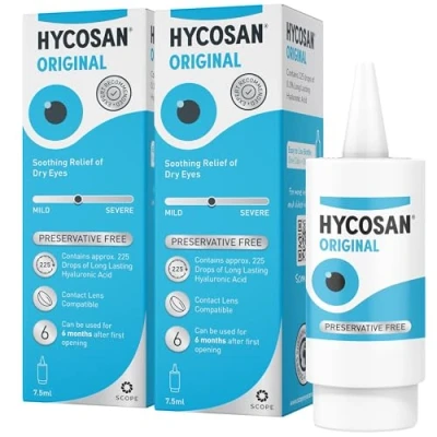 Hycosan Original is a preservative free dry eye drop which contains Sodium Hyaluronate, a natural ingredient that is used to replenish the tear film With a concentration of 0.1% it offers relief and managing of symptoms for those suffering from moderate dry eyes and discomfort associated with environmental conditions Do you wear contact lenses? Not a problem as Hycosan Original dry eye drops can be used by contact lens wearers Hycosan Original Eye drops for dry eyes are contained within a unique bottle design. 1 pump of the bottle gives 1 drop A long-lasting and robust formula. Can be used for 6 months after first opening and can be stored at room temperature