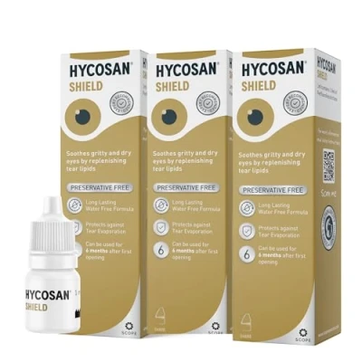 Dry eyes, burning, irritation? Hycosan Shield is a new breakthrough eye drop formula for the management of evaporative dry eye and MGD symptoms New, single ingredient formulation - contains 100% Perfluorohexyloctane – a molecule which helps stabilize the lipid layer Low surface tension eyedrops allows for quick spreading over the eye for rapid relief and minimal visual impairment Offers complete lipid layer replacement protecting the eye layer beneath 280 single applications and up to 6 months of sterility once opened