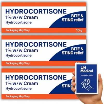 Hydrocortisone Cream 1% w/w Bite and Sting Cream, Mosquito Bee Treatment, Itchy Skin Redness Solution, 3 x 10g Tubes JJH Medical Bundle Including Relief Guide Packaging May Vary