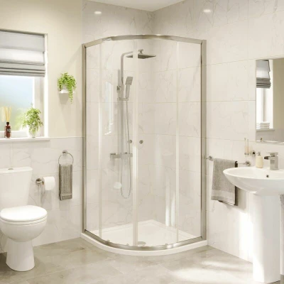 General description The Hydrolux Modern Quadrant Shower Enclosure is designed to combine style and functionality. Featuring a lightweight polished aluminium frame and 4mm thermally toughened safety glass, this enclosure not only enhances the aesthetic of your bathroom but also ensures durability and ease of use. With a height of 1850mm, it effectively prevents water splashes while providing a premium look. The enclosure is quick and easy to install, making it a perfect choice for any bathroom renovation. Technical specifications Type: Quadrant Enclosure Width: 800mm Height: 1850mm Depth: 800mm Glass Thickness: 4mm Frame Style: Framed Frame Colour: Chrome Door Opening Width: 395mm Reversible Door: Yes Installation Type: Corner Fixing (2 solid walls / 2 glass panels) Compatibility and accessories Shower tray and waste are not included Installation Designed for quick and easy installation Can be fitted in a corner with two solid walls and two glass panels Usage Easy-Grip handles for
