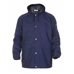 Zip front with storm flap cover and press stud closure Fixed hood Elasticated cuffs with press stud closure 2 front pockets with flap Mesh polyester lining Simply no Sweat (SNS) 210gsm Polyester laminate fabric Highly breathable providing great comfort Durable and cost effective Smooth polyester textile finish Conforms to EN343 Class 3 Water penetration Conforms to EN343 Class 3 Breathability