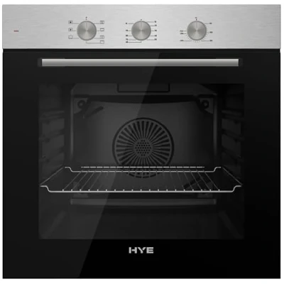 HYE Built In Oven Stainless Steel Panel, Black Glass Door, 0+7 Cooking Functions, Mechanical Timer, Double Layer Low E Glass, Easy Clean Enamelled Interior, Cooling Fan, 1 Tray & Wire Grid,