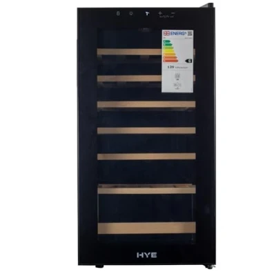 HYE Wine Cooler Fridge With 28 Bottle/88L Storage, 43CM Width, Wooden Shelves, LED Top Lighting, Temperature Range Adjustment, 40 dB Operation, Perfect For Collectors RF01WC28B31