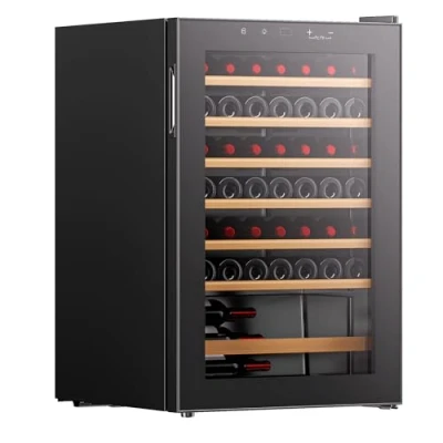 Generous 48-Bottle Capacity - Store up to 48 bottles of red, white, and rosé wine with precise temperature control, perfect for collectors, entertaining, or everyday enjoyment. Sleek Freestanding Design - Modern black finish, frameless tempered glass door, and smooth wooden shelves create a stylish display for your wine collection. Quiet & Energy-Efficient - Operates at only 41 dB and consumes 144 kWh/year, providing reliable cooling with minimal noise and low energy costs. Digital Temperature Control - Easy-to-use control panel allows precise adjustments to maintain optimal conditions for every type of wine. Durable & Flexible - Features a sturdy handle, reinforced hinge, and adjustable feet for stability, versatility, and long-lasting performance.