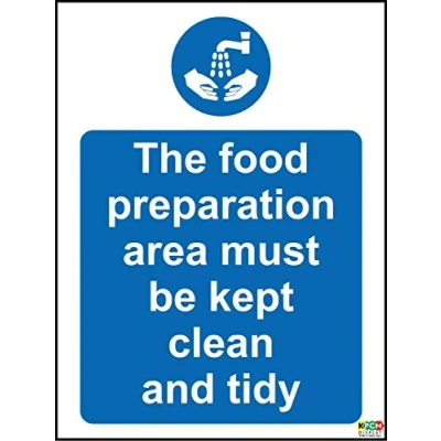 Hygiene catering The food preparation area must be kept clean and tidy safety sign Self adhesive sticker 200mm x 150mm Remove backing film and apply to dry, smooth, oil free surface. Digitally printed and laminated for extra durabillity