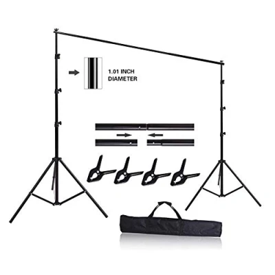 The Kit included 2 x Support Sand, 2 x Cross Bar, 4 x Spring Clamps, 1 x Carrying Case Professional heavy duty photo backdrop stand kit, Just Needs a Few Seconds To Set-up Whether Indoors or Outdoors Active 2 x Support Stand Adjustable height(Min3 ft to Max 8.6 ft.), made of 100% Aluminum material, Perfect lightweight aluminum alloy construction tripods. 2 x Crossbar Adjustable width (Min 5 ft to Max 10 ft), easy to connect, telescoping top crossbar,Max Load Capacity 26 lbs, safely use. 4 x Spring Heavy Duty clamps Holds canvas, muslin, paper / photo clamps provides comfortable & strong grip to prevent backdrop slip-out. keep it fixed on the background stand. 1x Portable Carry Bag Premium Quality Nylon Material with sturdy zipper .Easy to transport and store