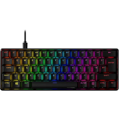 AmazonPetite 60% form factor HyperX mechanical switches, Full aircraft-grade aluminium body Double shot PBT keycaps with side-printed secondary functions RGB backlit keys with radiant lighting effects, Advanced customization with HyperX NGENUITY software Three adjustable keyboard angles and detachable USB-C cable, Included keycap puller and additional keycaps, Onboard memory, Game Mode, 100% anti-ghosting, and N-key rollover functionalities, Multi-platform compatibility
