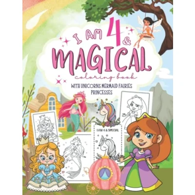 I Am 4 & Magical: Coloring Book with Unicorns Mermaids Fairies Princesses. Birthday Gift/ Christmas Gift For Year Old Girl.