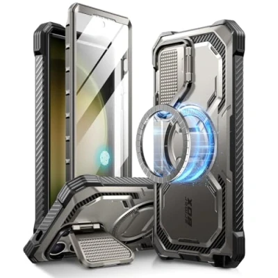 [Compatibility] Compatible with Galaxy S24 Ultra 6.8 Inch (2024 Release). [Built-in Screen Protector] Built-in screen protector prevents scratches and cracks to screen without compromising touch sensitivity. [Built-in Camera Cover doubles as Kickstand] Zinc alloy camera cover doubles as a multi-angle kickstand. [Compatible with Wireless Charger] Built-in 12X N52 magnets offer faster and more efficient wireless charging. [Military Protection] Shock-absorbing TPU and raised bezels protect from bumps, drops and scratches. (Certified MIL-STD 810G-516.6)