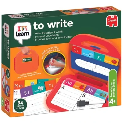 MAKE WRITING FUN: The writing game is both fun and interactive, designed to be engaging with this writing tool for kids that boosts children's vocabulary, improves dexterity and hand eye coordination. BUILDS CONFIDENCE: The self correcting light up base allow your child to correct themselves, helping to build confidence and encouraging them to use problem solving skills to learn independently. 94 EXERCISES & 5 LEVELS: Ideal for all abilities, the writing practice game allows your child to develop fine motor skills and improve their handwriting as they write their first letters and words. PORTABLE & COMPACT: The writing game includes a practical carry case, making it easy to take on the go. The travel case ensures that learning and fun can happen anywhere, be it at home or on the move. EDUCATIONAL GAMES FOR KIDS: I Learn to Write provides the ideal preschool learning resource for children that helps to improve their writing ability. For young boys and girls ages 4 years plus., Manufacturer: Jumbo
