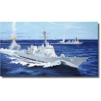 Plastic model kit of a US destroyer from the 2000s with 1200 parts, metal and photoetched parts and a helicopter SH-60B. Length built 779 mm / width 111 mm., Manufacturer: Faller