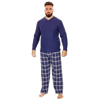 i Smalls Men's Warm Winter Pyjama Set Brushed Ribbed Cotton Top Checked Bottoms (M) Marine Blue