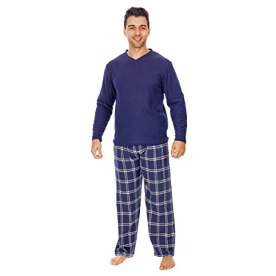 i Smalls Men's Warm Winter Pyjama Set Fleece Top Checked Bottoms (M) Marine Blue