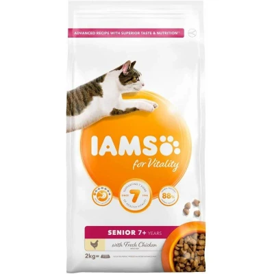 General description IAMS for Vitality Senior Cat Food with Fresh Chicken is a 100% complete and balanced nutrition designed specifically for senior cats. This improved recipe is crafted with high-quality animal protein to support your cat's 7 signs of healthy vitality, ensuring they remain healthy, active, and full of life. Technical specifications Weight: 2 kg Protein content: 88% chicken (of total protein) Usage Supports digestive health with a tailored fiber blend of prebiotics and beet pulp. Helps maintain strong muscles and bones through high-quality protein and essential minerals. Promotes a shiny skin and coat with a balance of omega 3 and 6 fatty acids. Formulated to reduce urinary pH for urinary tract health. Contains an antioxidant blend with vitamin E to support the immune system. Includes essential nutrients like taurine to nourish the heart.