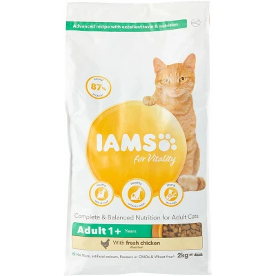 General description IAMS for Vitality Adult Cat Food with Fresh Chicken is a 100% complete and balanced nutrition designed for adult cats. This improved recipe is crafted with high-quality animal protein to support your cat's 7 signs of healthy vitality, ensuring they remain healthy, active, and full of life. Technical specifications Weight: 2kg Protein content: 87% animal protein (out of total protein) Usage Supports urinary tract health by reducing urinary pH Maintains strong muscles and joint health through high-quality protein and essential minerals Promotes a shiny coat with a balance of omega 3 and 6 fatty acids Enhances immune system support with an antioxidant blend including vitamin E Contributes to dental health with tailored mineral levels in kibble Improves digestive health with a blend of prebiotics and beet pulp Nourishes the heart with 7 essential nutrients