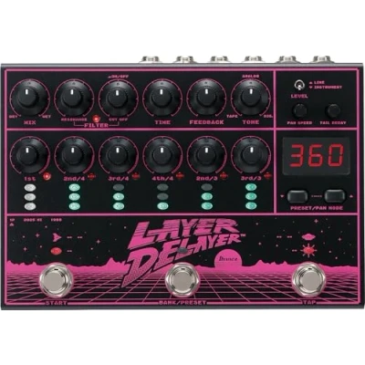 Multi-Layer Delay Engine with Independent Control: The Ibanez LD303 Layer Delayer goes far beyond traditional delay pedals by generating quarter-note delays alongside 16th-note and triplet layers. Each delay signal has its own volume control, allowing precise balancing and boosting of individual layers up to +3dB for complex rhythmic patterns and evolving textures. Tone Shaping from Digital to Tape-Style Echo: The TONE control smoothly transitions between digital, analog and tape-style delay characters, enabling everything from pristine modern repeats to warm vintage echoes and saturated textures. This makes the Layer Delayer adaptable to ambient soundscapes, rhythmic delay work and experimental sonic design. Moog-Style Ladder Filter with Resonance Control: The FILTER section emulates a classic low-pass ladder filter inspired by iconic Moog synthesizer designs. Adjustable cutoff and resonance allow subtle smoothing or aggressive, edgy filtering, adding movement and character to the delayed signal that traditional delay pedals simply cannot achieve. Stereo Auto-Panning & Tail Decay Control: With 8 auto-panning modes, the Layer Delayer lets delay signals sweep dynamically across the stereo field, including left-right, right-left and ping-pong patterns. Adjustable sweep width and speed enhance spatial depth, while the TAIL DECAY control determines how long delays persist after bypass. MIDI Control, FX Loop & Creative Routing: Full MIDI support allows control of all parameters and synchronisation via MIDI clock for tempo-accurate delays. An onboard FX loop lets you insert external effects directly into the delay path, opening up endless creative routing options for guitarists, bassists, keyboard players and producers.