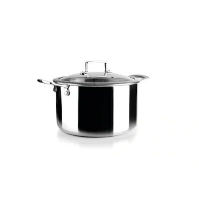 Made of three-layer material: 18/10 stainless steel on top face + inner aluminum + 18% stainless steel on bottom face, stainless steel handles. 26 cm 8 litre cooking pot, glass lid with stainless steel rim to control cooking without lifting the lid. The stainless steel provides strength and robustness, while the inner aluminum provides a fast and homogenous heat conductivity Suitable for all types of cookers, including induction, also suitable for ovens. No chemical coatings, free of PFAS, for a more natural and environmentally friendly cooking.