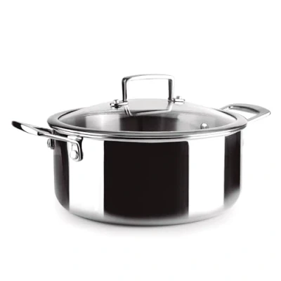 Made of three-layer material: 18/10 stainless steel on top face + inner aluminum + 18% stainless steel on bottom face, stainless steel handles. 20 cm saucepan with glass lid with stainless steel rim to control cooking without lifting the lid. The stainless steel provides strength and robustness, while the inner aluminum provides a fast and homogenous heat conductivity Suitable for all types of cookers, including induction, also suitable for ovens. No chemical coatings, free of PFAS, for a more natural and environmentally friendly cooking.