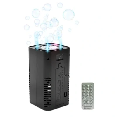 BUBBLE-DREAM: Portable, battery-powered light bubble machine (4 x AA - 1.5V). It will amaze you with its impressive production of soap bubbles that swirl in space, illuminated by 4 LEDs that give colours to the bubbles and make them appear in the dark. FEATURES: 100ml reservoir (recommended liquid: BUBBLE5L- Ibiza) - Light mode: disco light mode with bubbles, colour of your choice and bubbles, only bubbles and only LEDs - 12-hole bubble wheel - 4 RGB LEDs - COMPACT: With its very small size, this bubble machine will be discreet but will produce a large quantity of bubbles up to 2.5m high. SYNCHRO: Synchronise your BUBBLE-DREAMs with each other and create special effects. 1 remote control for all your BUBBLE-DREAMs. Create hurdles of honour at a festive event, for example. PACK: 1 x BUBBLE DREAM (9.5 x 9.5 x 1.71mm) - 1 x Remote control - 1 x User manual
