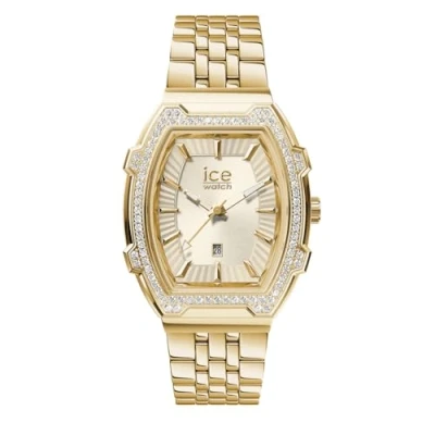 The ICE boliday - Full shiny almond stones with its stainless steel jubilee bracelet is the epitome of contemporary elegance. This Analogue watch features a calendar function: Date and is equipped with Luminous Hands High quality Gold Stainless steel strap, measuring 19 cm in length and 18 mm in width, with a Fold over with push button clasp. Case measurement: 35 X 45 mm,case thickness: 12 mm, case colour: Gold and dial colour: Gold Water resistant: 5 bars-Weight: 121 g The watch is delivered in an original gift box and has a warranty of 2 years