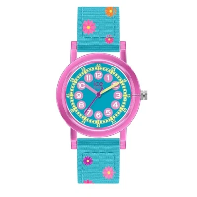 Discover ICE time learning, the watch designed to help your child learn the time with style and ease. Featuring enchanting flower motifs, this watch is the perfect everyday accessory. High quality 17 cm length and 14 mm width a Turquoise Nylon strap with a Buckle Case diameter: 28 mm,case thickness: 8 mm, case colour: Pink and dial colour: Turquoise Water resistant: 3 bars-Weight: 17 g The watch is delivered in an original gift box and has a warranty of 2 years