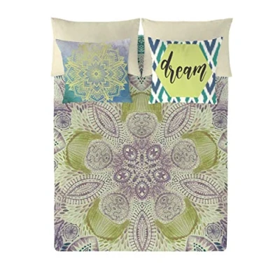 Includes: 1 x reversible duvet cover + 1 x beige pillowcase Square cushions shown in the photo are sold separately; no fitted sheet included. Composition: 100% cotton 144 threads; digital print; flap closure Size 135 bed: 1 duvet cover: 220 x 220 cm; and 1 beige pillowcase 45 x 150 cm. Washing: Machine washable at 40; Wash inside out; First wash should be done separately; Iron at 150; Do not dry clean; Lay immediately after the wash cycle