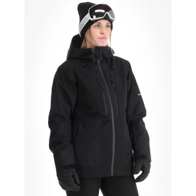 Icepeak Cavour insulated women's ski jacket. A technical, insulated jacket designed for on-piste and resort use, combining weather protection with freedom of movement in a relaxed fit. The longer back hem gives extra coverage when skiing or sitting on a lift. Constructed in a two-layer fabric with 4-way stretch, the jacket uses polyester and recycled polyester and features an AWS_Extreme membrane. The fabric is waterproof to 15 000 mmH2O and offers a breathability rating of 10 000 g/m²/24h. Fully taped seams and windproof construction maintain dryness in variable conditions. Insulation provides consistent warmth, corresponding to a warmth rating of 4. A fixed powder skirt prevents snow ingress, while a fixed hood is adjustable and compatible with a helmet. Pre-shaped sleeves and a loose, relaxed cut accommodate layering and skiing movements. Practical details include a zip pocket for a ski pass, a vertical chest pocket, large front pockets, a dedicated goggle pocket and inner storage. Cuffs are adjustable with stretch panels and thumbholes, and the hem can be adjusted for fit. All pockets are arranged for easy access on the slopes. Technical summary. Waterproof rating 15 000 mmH2O. Breathability 10 000 g/m²/24h. Fully taped seams. Two-layer, 4-way stretch fabric. Insulated with warmth rating 4. Fixed, adjustable helmet-compatible hood. Fixed powder skirt. Relaxed fit.