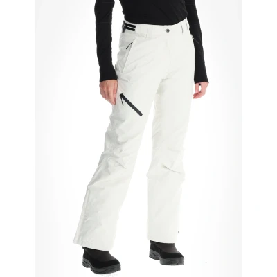 Icepeak Curlew insulated ski pants for women. These pants combine a two layer, waterproof shell with cushioning insulation to suit full days on the mountain. The fabric system gives a watercolumn of 10 000 mmH2O and a breathability rating of 10 000 mmH2O, while fully taped seams keep moisture out. The cut is a regular fit with preformed knees for natural movement and a warmth level rated as 4, suitable for cold piste conditions and winter resorts. Practical design details include a higher rear waist for added protection when skiing and an adjustable waist for a personalised fit. Zip pockets provide secure storage for essentials. The leg hems have a zipped opening, making them easy to pull over ski boots, and internal snow gaiters stop snow from entering the pants. The outer fabric is polyester, incorporating Repreve recycled polyester for a reduced environmental footprint. Insulation uses AWS Extreme technology to retain heat without excessive bulk. The two layer construction is breathable and waterproof, making these pants versatile for alpine skiing and other winter activities where weather protection and mobility are required. Technical highlights. Watercolumn 10 000 mmH2O. Breathability 10 000 mmH2O. Fully taped seams. Two layer waterproof fabric. Repreve recycled polyester. High back waist with adjustable fastening. Zip pockets. Preformed knees. Leg hem zip with snow gaiter. Regular fit.
