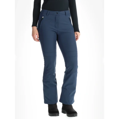 AmazonThe Icepeak Entiat softshell ski trousers for women have the following features: The Icepeak Entiat softshell ski trousers for women are windproof and waterproof trousers that allow you to effortlessly drive down the mountain. Specifications: fit: slim fit; high waist; elastic waist; waterproof: active wear system active: water and windproof up to 10,000 mm water column value; water-repellent material temperature regulation: breathability of 5,000 g/m²/24h; insulating lining pockets: two pockets with zip; snow guard: fixed snow gaiters and short zips on the leg ends; colour: dark blue; material: 90% polyester - 10% elastane