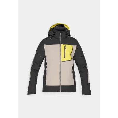 Icepeak Frisco insulated ski jacket for men. A practical, well appointed jacket that combines weather protection with insulating warmth for use on the piste and around resort. The shell is a two layer construction with 2-way stretch for improved mobility. It offers a 15 000 mm watercolumn and 10 000 g/m²/24h breathability, and seams are fully taped to maintain waterproof performance. The front features a waterproof zip with a chin protector to reduce wind intrusion and abrasion. Insulation is specified as Warmth 4 Warm, providing a higher level of thermal protection for colder days. The hood is adjustable and detachable, while the hem and cuffs are adjustable to trap heat where needed. A fixed snow gaiter prevents snow from getting inside the jacket when you make fast turns or take a fall. Fit and comfort follow practical alpine principles. The regular fit accommodates layering without restricting movement. Pre-shaped sleeves and stretch fabric give natural freedom of motion. Cuffs combine adjustable closures with stretch panels and thumbholes for secure fit and glove compatibility. A comfortable inner collar and lining pockets add everyday comfort, and a dedicated headphone port keeps devices accessible. Storage is arranged for skiing needs, with inner pockets and a ski pass pocket positioned for easy access. Fabric content includes polyester (PES) with recycled polyester components, and the jacket uses AWS Extreme insulation technology. The result is a windproof, waterproof insulated jacket that balances protection, comfort and functional detailing for on-slope use.