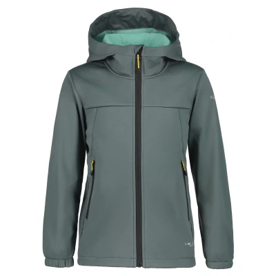 Icepeak Kline Jr softshell ski jacket for kids. A practical outer layer designed for active children who need weather resistance and freedom of movement on the slopes and during winter play. Constructed from polyester softshell with 4 way stretch, the jacket combines a windproof face with the AWS Active membrane for balanced performance. The fabric delivers reliable protection while remaining flexible, so children can move easily when skiing, learning to ski, or taking part in outdoor activities. Weather performance is measured by a water column of 8 000 mm, giving good resistance to wet snow and light rain. Breathability is rated at 3 000 g/m2/24h, helping to reduce internal moisture during activity. A fixed hood provides added coverage and a zip with chin protector improves comfort and prevents irritation at the neck. The Kline Jr has a regular fit that allows for layering underneath without restricting movement. The softshell construction sheds wind, insulates against cold, and remains comfortable during active play. Practical details focus on functionality rather than fuss, for straightforward, dependable use on piste or off.