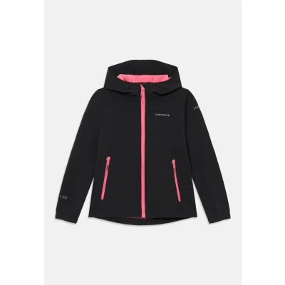 The Icepeak Kobryn softshell jacket for children has the following features: The Icepeak Kobryn softshell jacket for children is a comfortable jacket for cool spring and autumn days. Specifications: Fit: regular fit. Waterproof: water repellent. Temperature regulation: breathability of 3,000 mm. Windproof material. Soft fleece lining for extra warmth. Cuffs: elastic inner cuffs. Pockets: two pockets with zip. Hood: fixed hood. Zip: full-length zip. Colour: black/pink. Material: 94% polyester, 6% elastane