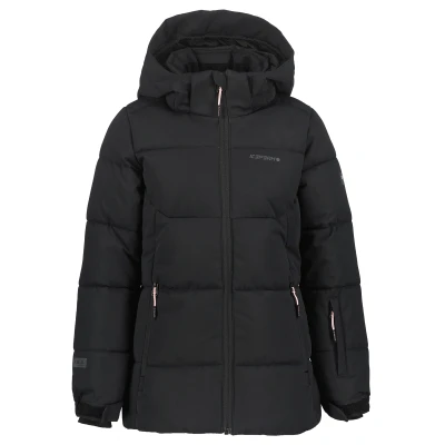 Icepeak Loris Jr insulated ski jacket for kids. A practical jacket designed for slopes and winter play, offering a balance of weather protection and lightweight insulation. Constructed from a two layer, waterproof fabric using AWS_Extreme and polyester (PES). The jacket has a 10,000 mm water column and a breathability rating of 5,000 g/m2/24h, suitable for active children who move between cold, snowy conditions and higher activity levels. Functional details include a front zipper with a chin protector, a fixed snowgaiter to keep out drifting snow, and an adjustable, detachable hood for flexibility in changing weather. Inner pockets provide secure storage, and a dedicated ski pass pocket on the sleeve keeps lift access convenient. Cuffs combine adjustability with a stretch inner cuff for a comfortable seal, and the hem is adjustable to fine tune the fit. The regular fit allows room for base layers and midlayers without restricting movement. Lightweight insulation gives warmth without bulk, making the jacket suitable for ski lessons, downhill runs and general winter use.