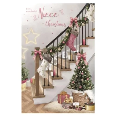 ICG Wonderful Niece Christmas Card Tree and Staircase Embossed with Foil Flitter Details