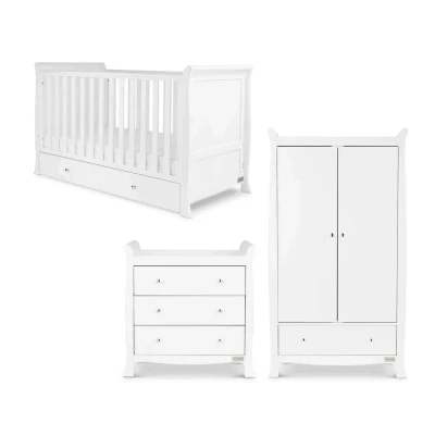 Why Buy Me? The Snowdon Classic 3 Piece with Cot Bed, Changing Unit and Wardrobe has adistinctive and traditional sleigh design and is ideal for those parentswho want a heritage look, suited to a modern lifestyle. The Snowdon Classic Cot Bed has open slatted sides that are great forwatching over your little one as they rest and includes teething railsto protect your child. Designed with three height positions, the topposition is ideal for your baby to be taken in and out of the cot bed,without any unnecessary bending and is suitable from birth toapproximately 6 months. When your baby is learning to sit and stand, themattress base can then be lowered by a further two positions, providingextra security and reassurance. Once your little one is ready to progress to a bed, the Snowdon Classic CotBed can convert easily into a stylish Toddler Bed suitable for a childup to approximately four years old, offering maximum longevity and great value. The Classic Cot Bed requires a 140 x 70cm mattress. The matching Under Drawer ensures maximum capacity for storing baby’sessentials and comes complete on runners and with elegant handles for simple access. The stylish Changing Unit features a changing station that allows you to comfortably change and dress your baby and can accommodate a changing mat up to 76cm x 46cm. Three deep drawers ensure that all your baby’sessentials are within easy reach, where you need them, and feature the same elegant handles to match the rest of the Snowdon collection. The Wardrobe is a beautiful addition to your nursery that compliments the other items in the Snowdon range. Including a full-sized interior thatmeans you don’t need to compromise on storage. It also includes twohanging rails and a lower drawer, offering lots of space for all of little one’s outfits. Large doors are supported by soft close hinges to gently close with minimal noise, ideal for a nursery. Brand: Ickle Bubba Product Type: Nursery & Playroom Furniture Product Sub-Type: Furniture Sets Functionality CLASSIC COT BED Adjustable, three-position base height Both ends split downeasily for conversion from cot to toddler bed Suitable from birthto approximately four years old Elegant handles onunder drawer External dimensions: 91(h) x 76(w) x 154(d)cm (H: 35.83 inches x W: 29.92 inches x D: 60.63inches) Includes your choice of 140 x 70cm mattress (55.12 inches x 27.56 inches) CHANGING UNIT/CHEST OFDRAWERS Changing top with three deep drawers Changing station that can accommodate changing mats up to 76cm x 46cm External dimensions: 91(h) x 90(w) x 50(d)cm (H: 35.83 inches x W: 35.43 inches x D: 19.69inches) (including top changer affixed) WARDROBE Two internal hangingrails One large lower full-width drawer Easy to use, stylishand modern handles External dimensions:175(h) x 98(w) x 50(d)cm (H: 68.90 inches x W: 38.58 inches x D: 19.69inches) GENERAL FEATURES Matching Snowdonfurniture available separately Delivered flat-packedand easy to assemble Great qualityand value