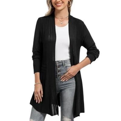 Soft, Breathable & Lightweight Comfort :Made from premium soft knit fabric, this women's lightweight cardigan offers a gentle, skin-friendly touch with a stretchy, breathable feel, keeping you comfortable all day. The ultra-lightweight design makes it ideal for layering, whether you're beating the office chill, enjoying a breezy summer evening, or transitioning between seasons effortlessly. Flattering Fit with Elegant Drape :Designed with a graceful waterfall front, mid-length silhouette, and tailored long sleeves, this ladies’ cardigan drapes beautifully over any figure, creating a streamlined, elongating effect. The open-front design makes it easy to layer over casual tops, fitted dresses, or office blouses, ensuring a polished yet relaxed look for every occasion. Your Go-To Cardigan for Every Occasion:Whether you're heading to work, running errands, meeting friends for brunch, or dressing up for a dinner date, this versatile long cardigan adapts effortlessly. Pair it with jeans for a casual-chic vibe, leggings for a cozy lounge outfit, or dresses for an effortlessly elegant ensemble—a truly seasonless wardrobe essential. Chic, Timeless Colors for Easy Styling :Available in classic black for a sleek look, bold red for a statement piece, elegant navy blue for sophisticated charm, and crisp white for a fresh, minimalist feel. This longline cardigan complements every wardrobe, making it easy to mix and match for a variety of stylish outfits. True-to-Size UK Fit for Every Body Shape:Designed for UK women, available in S (UK 6-8), M (UK 10-12), L (UK 14-16), XL (UK 16-18), XXL (UK 18-20). For the perfect fit, please refer to our size chart before ordering—a tailored look starts with the right size!