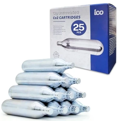 ICO 25 pack 12 gram CO2 Cartridge Non Threaded, or Airsoft Gas for BB Gun, Pistol, Air Rifle, and Paintball Gun